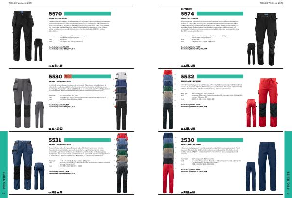 Helppohoitoiset polyesteri-puuvillahousut , jotka säilyttävät muotonsa ja värinsä . Riipputaskut , joissa lisätasku ja vetoketjullinen tasku . Läpälliset takataskut , joissa tarrakiinnitys . Läpällinen reisitasku , jossa lisätasku ja tarrakiinnitys . Mittatasku , jossa puukkonappi . Polvisuojat voidaan säätää kahdelle eri korkeudelle . Vahvikkeet riipputaskuissa , mittataskussa ja polvisuojataskuissa . Kokoja C42-C64 voidaan pidentää 5 cm .