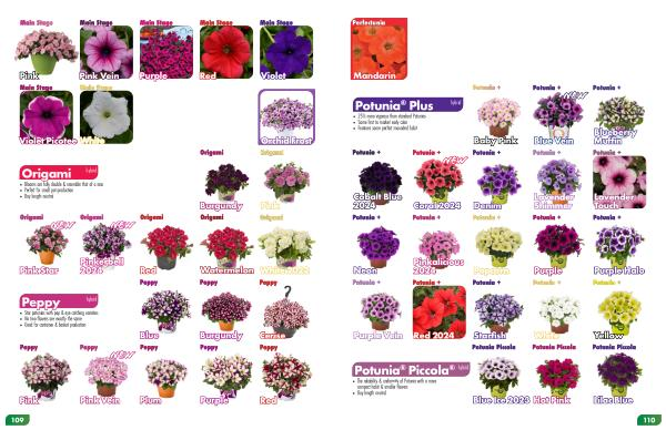 Pink Pink Main Stage Pink Vein Pink Vein Main Stage Purple Purple Main Stage Red Red Main Stage Violet Violet Main Stage Violet Picotee Violet Picotee Main Stage White White Main Stage Orchid Frost Orchid Frost Origami Origami hybrid • Blooms are fully double & resemble that of a rose • Perfect for small pot production • Day length neutral Burgundy Burgundy Origami Pink Pink Origami Pink Star Pink Star Origami New New Pinkerbell Pinkerbell 2024 2024 Origami New New Red Red Origami Watermelon Watermelon Origami White 2022 White 2022 Origami Peppy Peppy hybrid • Star petunias with pep & eye catching varieties • No two flowers are exactly the same • Good for container & basket production Pink Pink Peppy Pink Vein Pink Vein Peppy New New Plum Plum Peppy Purple Purple Peppy Red Red Peppy Burgundy Burgundy Peppy Cerise Cerise Peppy Blue Blue Peppy 109