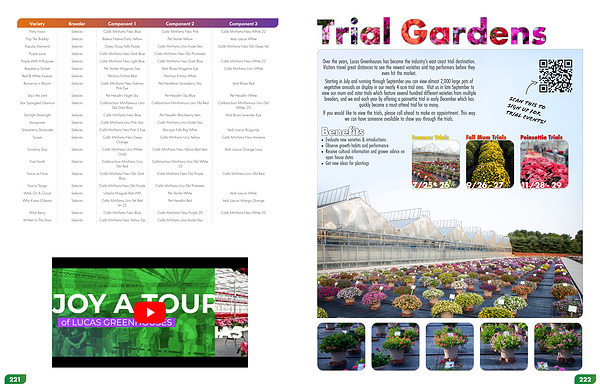 Starting in July and running through September you can view almost 2,000 large pots of vegetative annuals on display in our nearly 4 acre trial area . Visit us in late September to view our mum and aster trials which feature several hundred different varieties from multiple breeders , and we end each year by offering a poinsettia trial in early December which has quickly become a must-attend trial for so many .