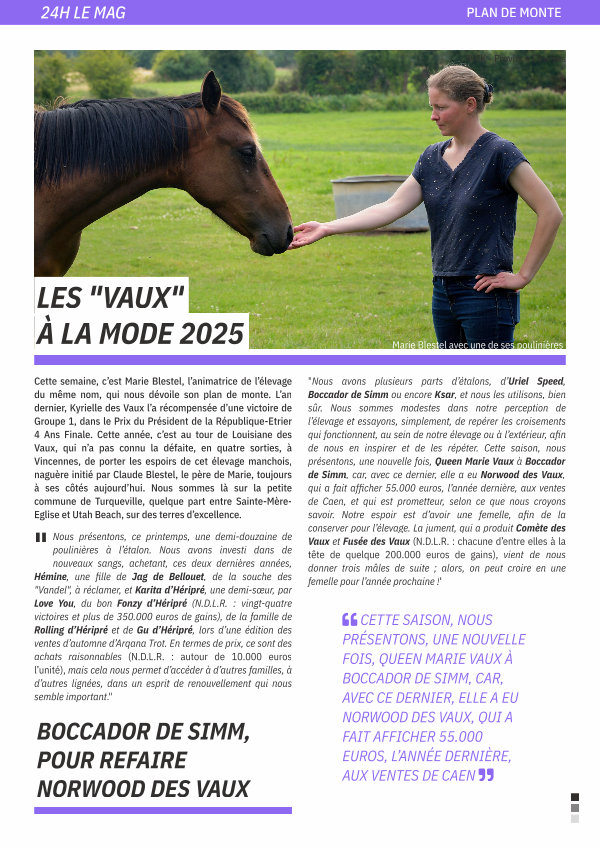 " Nous avons plusieurs parts d’étalons, d’ Uriel Speed , Boccador de Simm ou encore Ksar , et nous les utilisons, bien sûr. Nous sommes modestes dans notre perception de l’élevage et essayons, simplement, de repérer les croisements qui fonctionnent, au sein de notre élevage ou à l’extérieur, afin de nous en inspirer et de les répéter. Cette saison , nous présentons, une nouvelle fois, Queen Marie Vaux à Boccador de Simm , car, avec ce dernier, elle a eu Norwood des Vaux , qui a fait afficher 55.000 euros, l’année dernière, aux ventes de Caen , et qui est prometteur, selon ce que nous croyons savoir. Notre espoir est d’avoir une femelle, afin de la conserver pour l’élevage. La jument, qui a produit Comète des Vaux et Fusée des Vaux (N.D.L .R. : chacune d’entre elles à la tête de quelque 200.000 euros de gains), vient de nous donner trois mâles de suite ; alors, on peut croire en une femelle pour l’année prochaine !"