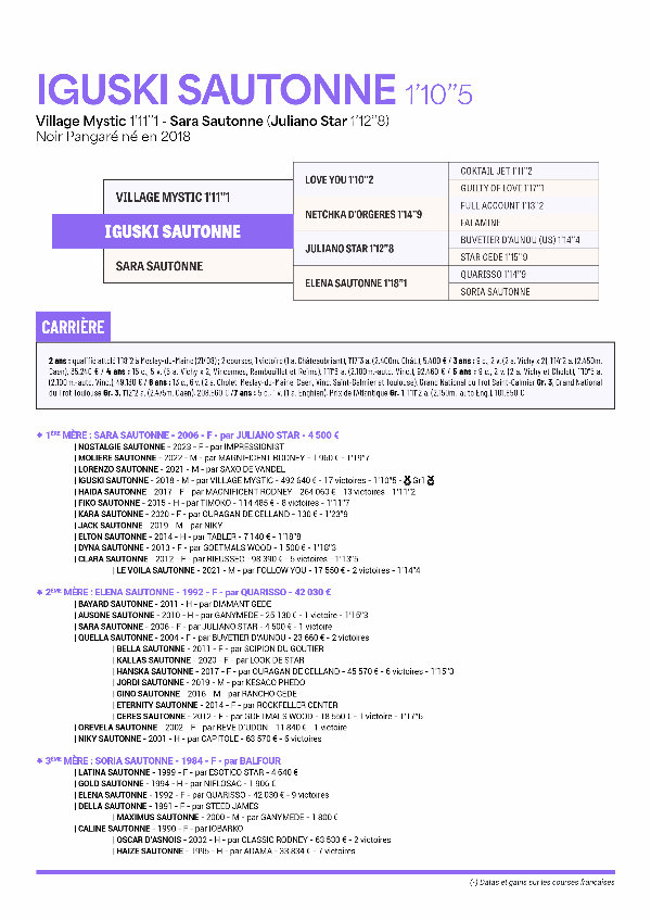 Sara Sautonne vient, malheureusement, de disparaître, à l’âge de 19 ans, après avoir mis bas une propre sœur d’ Iguski Sautonne , baptisée, symboliquement, Perpétue Sautonne . Le classique, fils de Love You 1’10’’, Village Mystic 1’11’’ (Prix de Sélection, deuxième du Critérium Continental), est à leur origine à tous les deux. Iguski Sautonne est son quatrième gagnant de Groupe 1, à ce jour, après Hanna des Molles 1’09’’ m. (Critérium des 3 Ans, Prix des Centaures, Prix de l’Ile-de-France, Prix Bilibili), Lovino Bello 1’09’’ (Critérium
