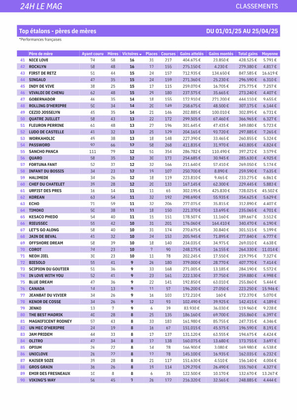 Top étalons - pères de mères DU 01/01/25 AU 25/04/25