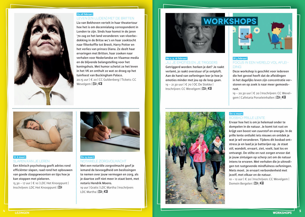 BOSBAD PRILLE LENTE Ervaar hoe het is om je helemaal onder te dompelen in de natuur. Je komt tot rust en krijgt een boost van zuurstof en energie. In de prille lente ontluikt iets nieuws en ontdek je wat je wil veranderen. Tijdens dit bosbad ontstress je en laad je je batterijen op. Je staat stil, wandelt, ervaart, ziet, voelt, laat los en ontvangt. De stilte en rust zorgen ervoor dat je jouw zintuigen op scherp zet om de natuur intens te ervaren. Met verhalen die je uitnodigen tot rustgevende mindfulness oefeningen. Niets moet. Je ervaart verbondenheid met jezelf, met elkaar en de natuur. 10- 12 uur | € 20 | Inschrijven: CC Wevelgem | Domein Bergelen | |