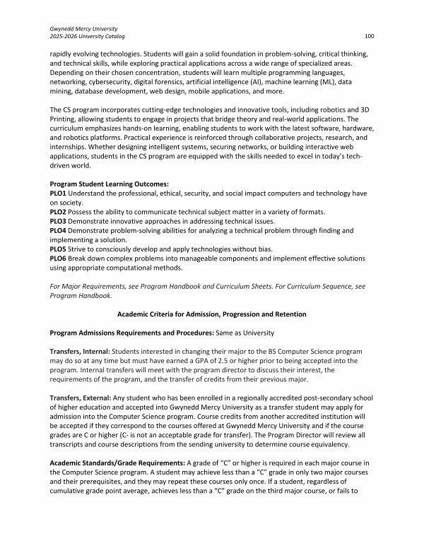 Transfers, External: Any student who has been enrolled in a regionally accredited post-secondary school of higher education and accepted into Gwynedd Mercy University as a transfer student may apply for admission into the Computer Science program. Course credits from another accredited institution will be accepted if they correspond to the courses offered at Gwynedd Mercy University and if the course grades are C or higher( C- is not an acceptable grade for transfer). The Program Director will review all transcripts and course descriptions from the sending university to determine course equivalency.