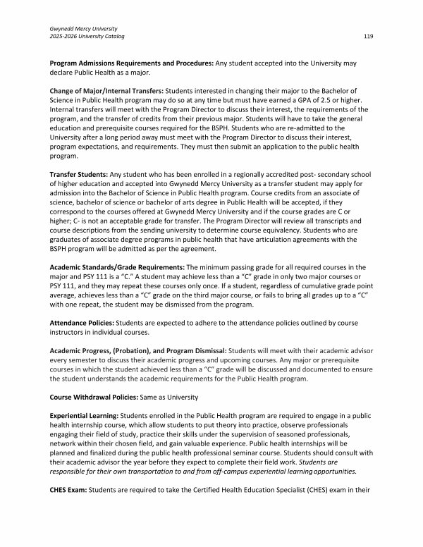Transfer Students: Any student who has been enrolled in a regionally accredited post- secondary school of higher education and accepted into Gwynedd Mercy University as a transfer student may apply for admission into the Bachelor of Science in Public Health program. Course credits from an associate of science, bachelor of science or bachelor of arts degree in Public Health will be accepted, if they correspond to the courses offered at Gwynedd Mercy University and if the course grades are C or higher; C- is not an acceptable grade for transfer. The Program Director will review all transcripts and course descriptions from the sending university to determine course equivalency. Students who are graduates of associate degree programs in public health that have articulation agreements with the BSPH program will be admitted as per the agreement.