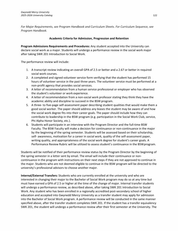 Internal / External Transfers: Students who are currently enrolled at the university and who are interested in changing their major to the Bachelor of Social Work program may do so at any time but must have earned a GPA of 2.5 or higher at the time of the change of major. Internal transfer students will undergo a performance review, as described above, after taking SWK 201 Introduction to Social Work. Any student who has been enrolled in a regionally accredited post-secondary school of higher education and accepted into Gwynedd Mercy University as a transfer student may apply for admission into the Bachelor of Social Work program. A performance review will be conducted in the same manner specified above, after the transfer student completes SWK 201. If the student has a transfer equivalency SWK 201, the student will undergo a performance review after their first semester at the University. The