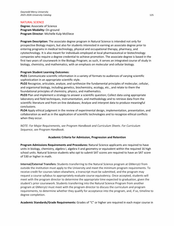 Internal / External Transfers: Students transferring to the Natural Science program at GMercyU from outside the institution must apply to the University and meet the minimum program requirements. To receive credit for courses taken elsewhere, a transcript must be submitted, and the program may request a course syllabus to appropriately evaluate course equivalency. Once accepted, students will meet with the program director to determine the appropriate time expected to graduation, given the student’ s prior coursework. Students transferring into the Natural Science Program from another program at GMercyU must meet with the program director to discuss the curriculum and program requirements, to determine whether they qualify for acceptance into the program, and, if so, timeline to degree completion.