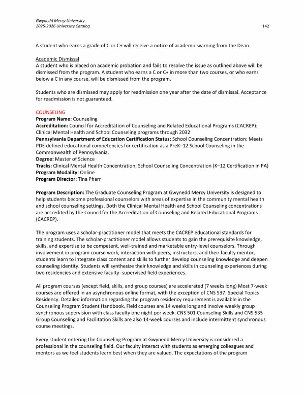 Program Description: The Graduate Counseling Program at Gwynedd Mercy University is designed to help students become professional counselors with areas of expertise in the community mental health and school counseling settings. Both the Clinical Mental Health and School Counseling concentrations are accredited by the Council for the Accreditation of Counseling and Related Educational Programs( CACREP).