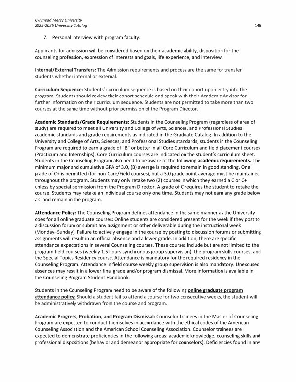 Academic Standards / Grade Requirements: Students in the Counseling Program( regardless of area of study) are required to meet all University and College of Arts, Sciences, and Professional Studies academic standards and grade requirements as indicated in the Graduate Catalog. In addition to the University and College of Arts, Sciences, and Professional Studies standards, students in the Counseling Program are required to earn a grade of“ B” or better in all Core Curriculum and field placement courses( Practicum and Internships). Core Curriculum courses are indicated on the student’ s curriculum sheet. Students in the Counseling Program also need to be aware of the following academic requirements. The minimum major and cumulative GPA of 3.0,( B) average is required to remain in good standing. One grade of C + is permitted( for non-Core / Field courses), but a 3.0 grade point average must be maintained throughout the program. Students may only retake two( 2) courses in which they earned a C or C + unless by special permission from the Program Director. A grade of C requires the student to retake the course. Students may retake an individual course only one time. Students may not earn any grade below a C and remain in the program.