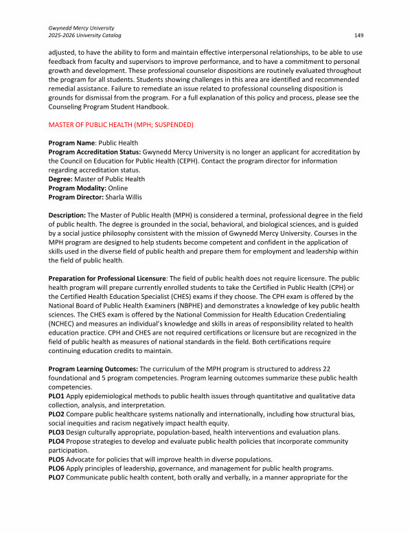 Program Name: Public Health Program Accreditation Status: Gwynedd Mercy University is no longer an applicant for accreditation by the Council on Education for Public Health( CEPH). Contact the program director for information regarding accreditation status. Degree: Master of Public Health Program Modality: Online Program Director: Sharla Willis