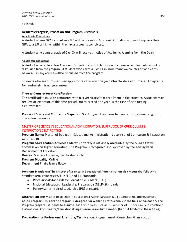 MASTER OF SCIENCE IN EDUCATIONAL ADMINISTRATION: SUPERVISOR OF CURRICULUM & INSTRUCTION CERTIFICATION Program Name: Master of Science in Educational Administration: Supervisor of Curriculum & Instruction Certification Program Accreditation: Gwynedd Mercy University is nationally accredited by the Middle States Commission on Higher Education. The Program is recognized and approved by the Pennsylvania Department of Education Degree: Master of Science; Certification Only Program Modality: Online Department Chair: Jaimie Bowen