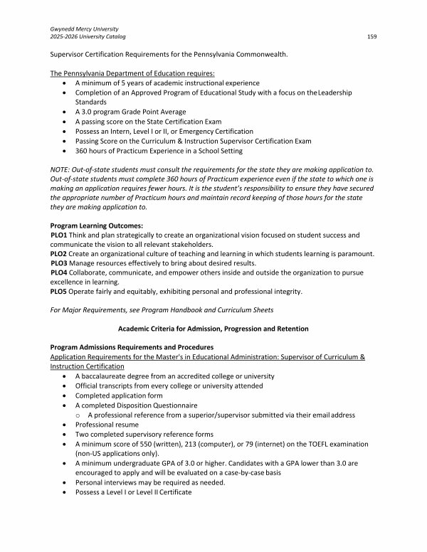 Program Admissions Requirements and Procedures Application Requirements for the Master ' s in Educational Administration: Supervisor of Curriculum & Instruction Certification