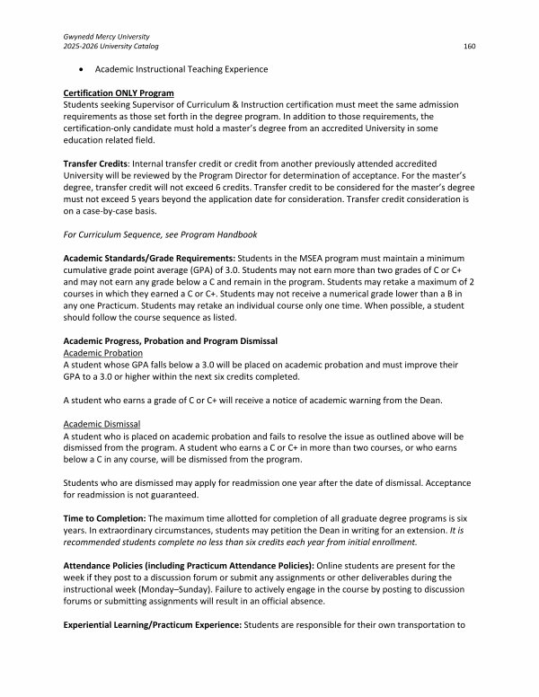 Academic Standards / Grade Requirements: Students in the MSEA program must maintain a minimum cumulative grade point average( GPA) of 3.0. Students may not earn more than two grades of C or C + and may not earn any grade below a C and remain in the program. Students may retake a maximum of 2 courses in which they earned a C or C +. Students may not receive a numerical grade lower than a B in any one Practicum. Students may retake an individual course only one time. When possible, a student should follow the course sequence as listed.