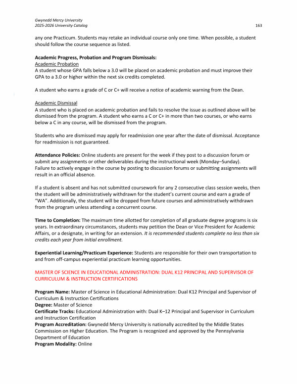 Program Name: Master of Science in Educational Administration: Dual K12 Principal and Supervisor of Curriculum & Instruction Certifications Degree: Master of Science Certificate Tracks: Educational Administration with: Dual K – 12 Principal and Supervisor in Curriculum and Instruction Certification Program Accreditation: Gwynedd Mercy University is nationally accredited by the Middle States Commission on Higher Education. The Program is recognized and approved by the Pennsylvania Department of Education Program Modality: Online