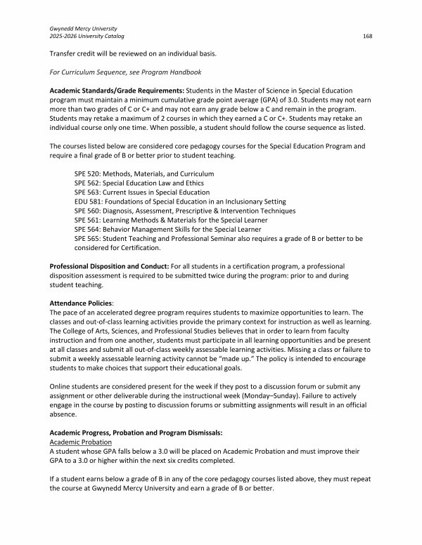 Academic Standards / Grade Requirements: Students in the Master of Science in Special Education program must maintain a minimum cumulative grade point average( GPA) of 3.0. Students may not earn more than two grades of C or C + and may not earn any grade below a C and remain in the program. Students may retake a maximum of 2 courses in which they earned a C or C +. Students may retake an individual course only one time. When possible, a student should follow the course sequence as listed.