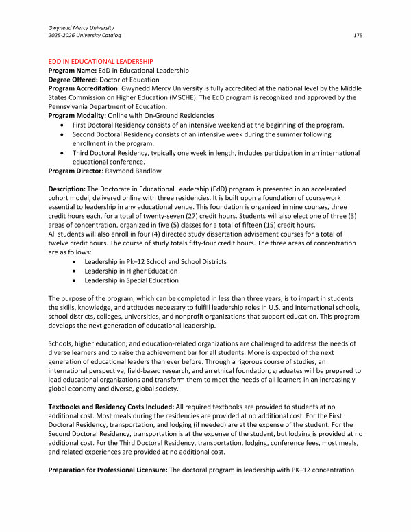 EDD IN EDUCATIONAL LEADERSHIP Program Name: EdD in Educational Leadership Degree Offered: Doctor of Education Program Accreditation: Gwynedd Mercy University is fully accredited at the national level by the Middle States Commission on Higher Education( MSCHE). The EdD program is recognized and approved by the Pennsylvania Department of Education. Program Modality: Online with On-Ground Residencies
