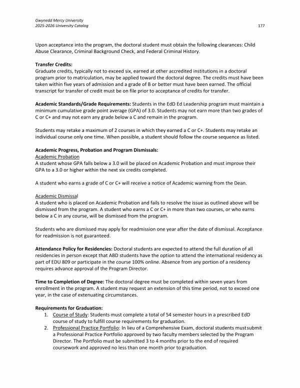 Requirements for Graduation: 1. Course of Study: Students must complete a total of 54 semester hours in a prescribed EdD course of study to fulfill course requirements for graduation. 2. Professional Practice Portfolio: In lieu of a Comprehensive Exam, doctoral students must submit a Professional Practice Portfolio approved by two faculty members selected by the Program Director. The Portfolio must be submitted 3 to 4 months prior to the end of required coursework and approved no less than one month prior to graduation.