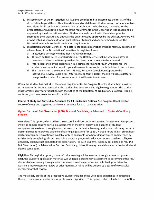 Overview: This option, which utilizes a structured and rigorous Prior Learning Assessment( PLA) process involving comprehensive portfolio assessments of the level, quality and quantity of student competencies mastered through prior coursework, experiential learning, and scholarship, may permit a doctoral student to provide evidence of learning equivalent for up to 27 credit hours in a 54-credit hour doctoral program. This option is available only to applicants who have demonstrated competence by satisfactorily completing all coursework in a doctoral program in education at an accredited college or university but have not completed the dissertation. For such students, typically designated as ABD( All But Dissertation) or Advanced to Doctoral Candidacy, this option may be a viable alternative for doctoral degree completion.