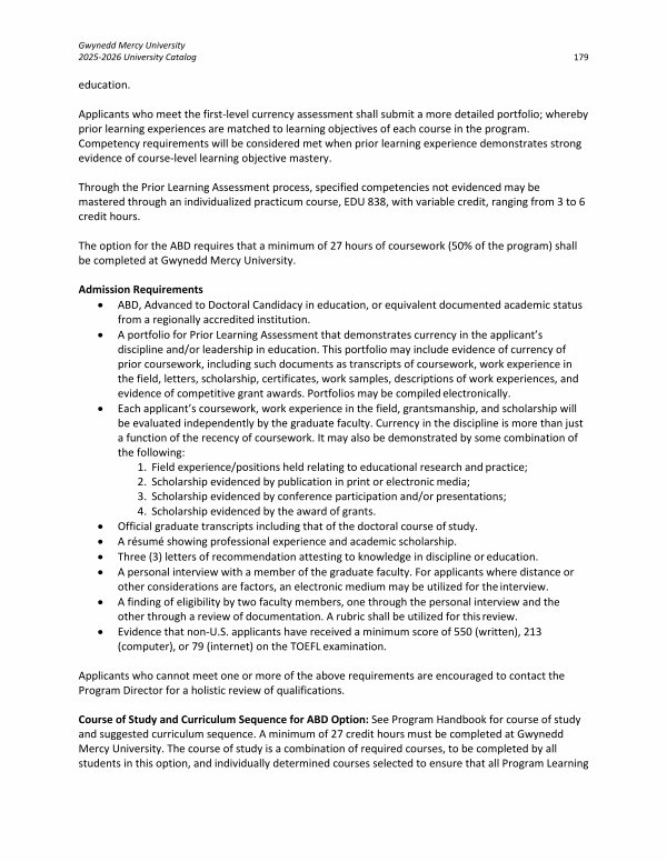 Course of Study and Curriculum Sequence for ABD Option: See Program Handbook for course of study and suggested curriculum sequence. A minimum of 27 credit hours must be completed at Gwynedd Mercy University. The course of study is a combination of required courses, to be completed by all students in this option, and individually determined courses selected to ensure that all Program Learning