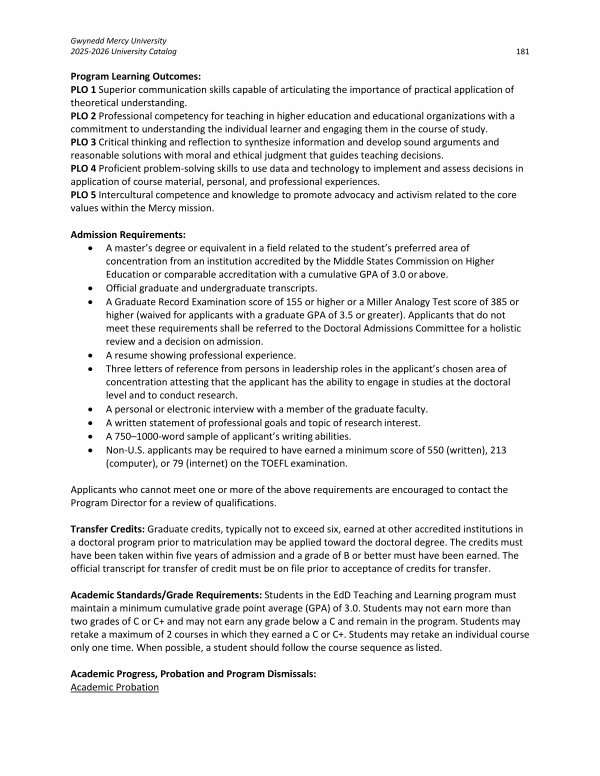 Program Learning Outcomes: PLO 1 Superior communication skills capable of articulating the importance of practical application of theoretical understanding. PLO 2 Professional competency for teaching in higher education and educational organizations with a commitment to understanding the individual learner and engaging them in the course of study. PLO 3 Critical thinking and reflection to synthesize information and develop sound arguments and reasonable solutions with moral and ethical judgment that guides teaching decisions. PLO 4 Proficient problem-solving skills to use data and technology to implement and assess decisions in application of course material, personal, and professional experiences. PLO 5 Intercultural competence and knowledge to promote advocacy and activism related to the core values within the Mercy mission.