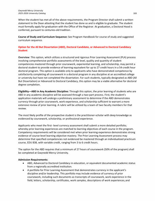 Overview: This option, which utilizes a structured and rigorous Prior Learning Assessment( PLA) process involving comprehensive portfolio assessments of the level, quality and quantity of student competencies mastered through prior coursework, experiential learning, and scholarship, may permit a doctoral student to provide evidence of learning equivalent for up to 27 credit hours in a 54-credit hour doctoral program. This option is available only to applicants who have demonstrated competence by satisfactorily completing all coursework in a doctoral program in any discipline at an accredited college or university but have not completed the dissertation. For such students, typically designated as ABD( All But Dissertation) or Advanced to Doctoral Candidacy, this option may be a viable alternative for doctoral degree completion.