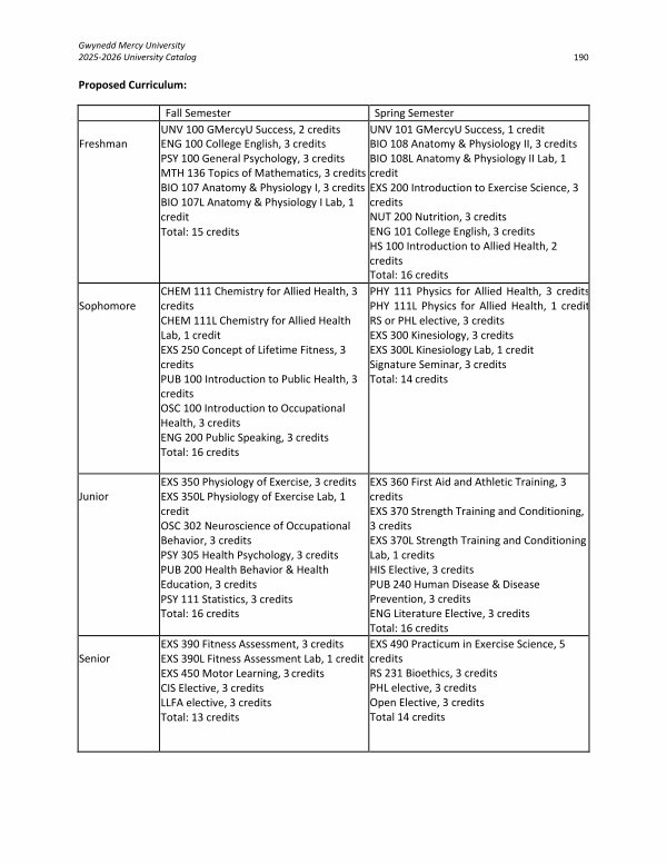 EXS 350 Physiology of Exercise, 3 credits EXS 350L Physiology of Exercise Lab, 1 credit OSC 302 Neuroscience of Occupational Behavior, 3 credits PSY 305 Health Psychology, 3 credits PUB 200 Health Behavior & Health Education, 3 credits PSY 111 Statistics, 3 credits Total: 16 credits