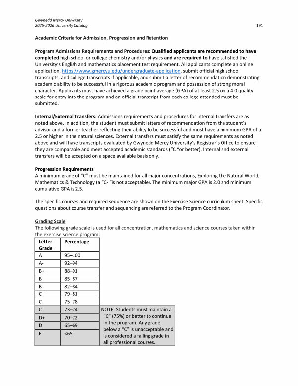 Internal / External Transfers: Admissions requirements and procedures for internal transfers are as noted above. In addition, the student must submit letters of recommendation from the student’ s advisor and a former teacher reflecting their ability to be successful and must have a minimum GPA of a 2.5 or higher in the natural sciences. External transfers must satisfy the same requirements as noted above and will have transcripts evaluated by Gwynedd Mercy University’ s Registrar’ s Office to ensure they are comparable and meet accepted academic standards(“ C“ or better). Internal and external transfers will be accepted on a space available basis only.