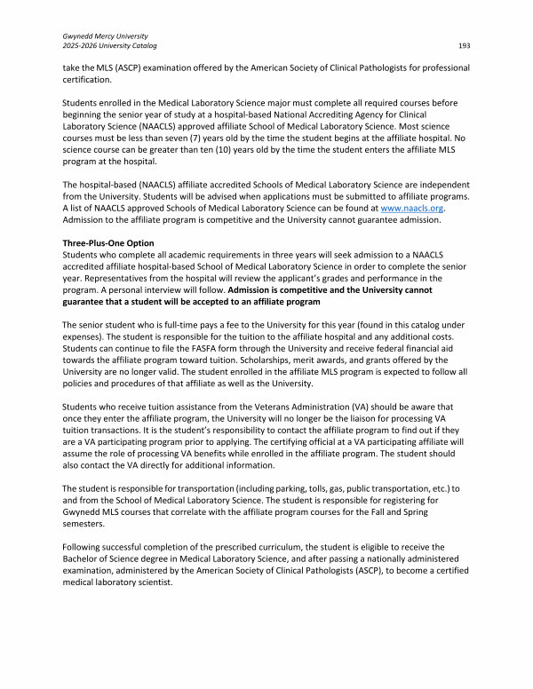 Three-Plus-One Option Students who complete all academic requirements in three years will seek admission to a NAACLS accredited affiliate hospital-based School of Medical Laboratory Science in order to complete the senior year. Representatives from the hospital will review the applicant’ s grades and performance in the program. A personal interview will follow. Admission is competitive and the University cannot guarantee that a student will be accepted to an affiliate program
