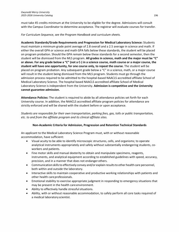 Academic Standards / Grade Requirements and Progression for Medical Laboratory Science: Students must maintain a minimum grade point average of 2.8 overall and a 2.5 average in science and math. If either the overall GPA or science and math GPA falls below these standards, the student will be placed on program probation. Should the GPA remain below these standards for a second semester, then the student will be dismissed from the MLS program. All grades in science, math and the major must be“ C” or above. For any grade below a“ C”( not a C-) in a science course, math course or a major course, the student will have one opportunity, for one course only, to repeat the course. The student will be placed on program probation. Any subsequent grade below a“ C” in a science, math, or a major course will result in the student being dismissed from the MLS program. Students must go through the admission process required to be admitted to the hospital-based NAACLS accredited affiliate School of Medical Laboratory Science. The hospital based NAACLS accredited affiliate School of Medical Laboratory Science is independent from the University. Admission is competitive and the University cannot guarantee admission.