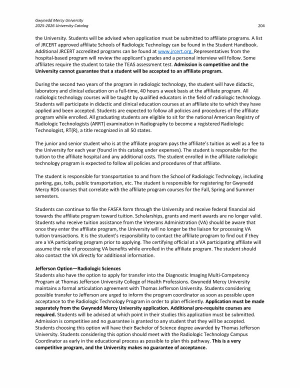 Jefferson Option— Radiologic Sciences Students also have the option to apply for transfer into the Diagnostic Imaging Multi-Competency Program at Thomas Jefferson University College of Health Professions. Gwynedd Mercy University maintains a formal articulation agreement with Thomas Jefferson University. Students considering possible transfer to Jefferson are urged to inform the program coordinator as soon as possible upon acceptance to the Radiologic Technology Program in order to plan efficiently. Application must be made separately from the Gwynedd Mercy University application. Additional pre-requisite courses are required. Students will be advised at which point in their studies this application must be submitted. Admission is competitive and no guarantee is granted to any student that they will be accepted. Students choosing this option will have their Bachelor of Science degree awarded by Thomas Jefferson University. Students considering this option should meet with the Radiologic Technology Campus Coordinator as early in the educational process as possible to plan this pathway. This is a very competitive program, and the University makes no guarantee of acceptance.