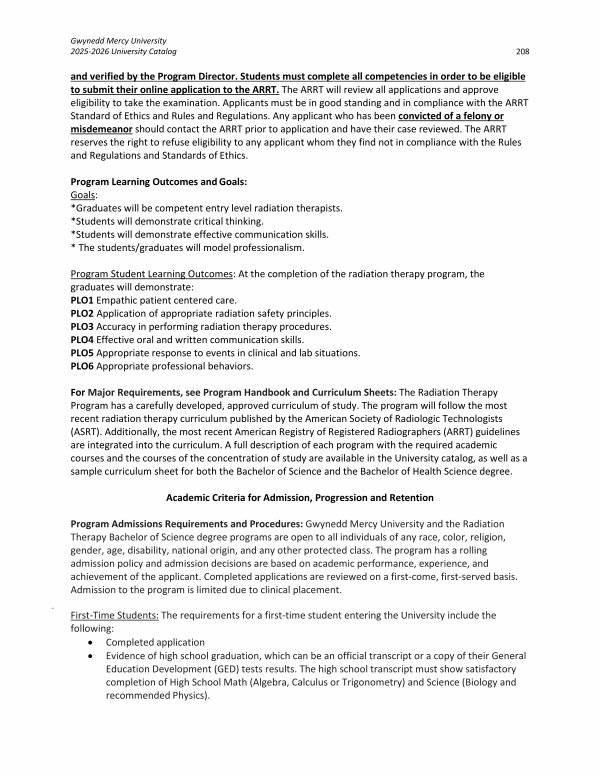 Program Admissions Requirements and Procedures: Gwynedd Mercy University and the Radiation Therapy Bachelor of Science degree programs are open to all individuals of any race, color, religion, gender, age, disability, national origin, and any other protected class. The program has a rolling admission policy and admission decisions are based on academic performance, experience, and achievement of the applicant. Completed applications are reviewed on a first-come, first-served basis. Admission to the program is limited due to clinical placement.