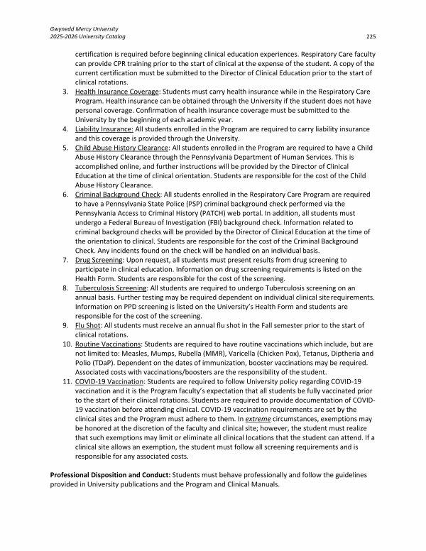 3. Health Insurance Coverage: Students must carry health insurance while in the Respiratory Care Program. Health insurance can be obtained through the University if the student does not have personal coverage. Confirmation of health insurance coverage must be submitted to the University by the beginning of each academic year.