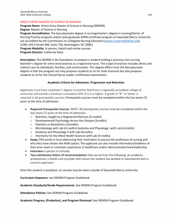 DIRECT-ENTRY MASTER OF SCIENCE IN NURSING Program Name: Direct-Entry Master of Science in Nursing( DEMSN) Degree: Master of Science in Nursing Program Accreditation: The baccalaureate degree in nursing / master’ s degree in nursing / Doctor of Nursing Practice program and / or post-graduate APRN certificate program at Gwynedd Mercy University are accredited by the Commission on Collegiate Nursing Education( www. ccneacreditation. org). CCNE; 655 K Street NW, Suite 750; Washington, DC 20001 Program Modality: In person, hybrid and online courses Program Director: Catherine Razzi