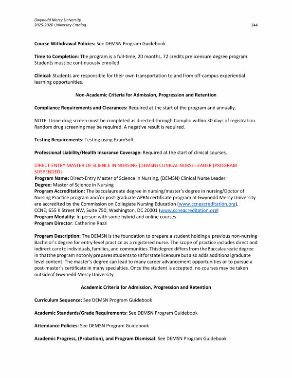 DIRECT-ENTRY MASTER OF SCIENCE IN NURSING( DEMSN) CLINICAL NURSE LEADER( PROGRAM SUSPENDED) Program Name: Direct-Entry Master of Science in Nursing,( DEMSN) Clinical Nurse Leader Degree: Master of Science in Nursing Program Accreditation: The baccalaureate degree in nursing / master’ s degree in nursing / Doctor of Nursing Practice program and / or post-graduate APRN certificate program at Gwynedd Mercy University are accredited by the Commission on Collegiate Nursing Education( www. ccneacreditation. org). CCNE; 655 K Street NW, Suite 750; Washington, DC 20001( www. ccneacreditation. org) Program Modality: In person with some hybrid and online courses Program Director: Catherine Razzi