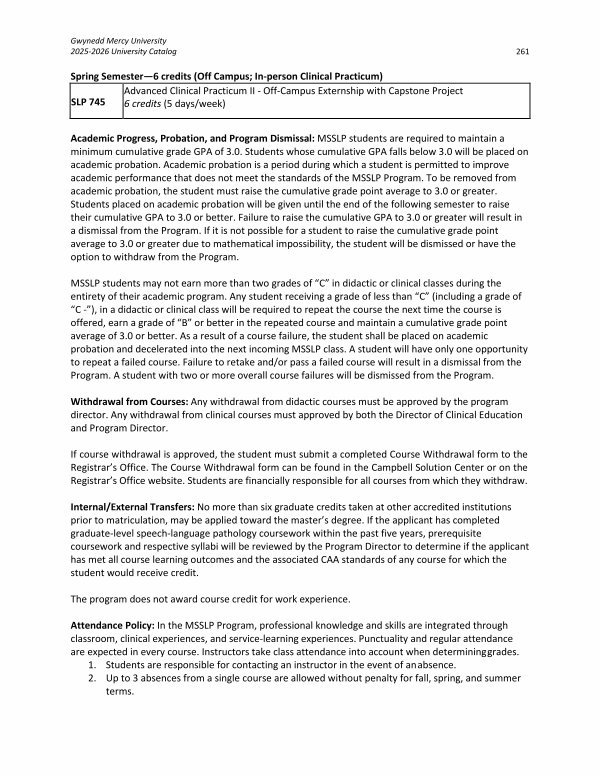 Attendance Policy: In the MSSLP Program, professional knowledge and skills are integrated through classroom, clinical experiences, and service-learning experiences. Punctuality and regular attendance are expected in every course. Instructors take class attendance into account when determining grades. 1. Students are responsible for contacting an instructor in the event of an absence. 2. Up to 3 absences from a single course are allowed without penalty for fall, spring, and summer terms.