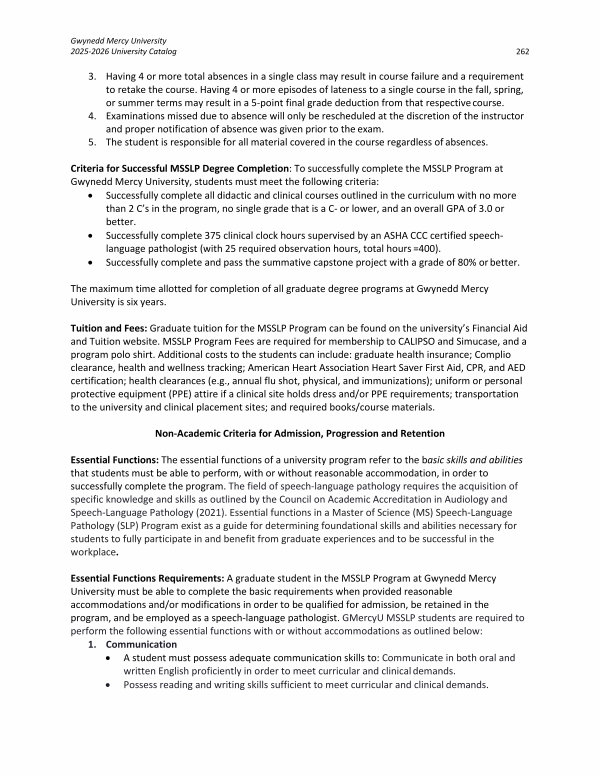 Essential Functions Requirements: A graduate student in the MSSLP Program at Gwynedd Mercy University must be able to complete the basic requirements when provided reasonable accommodations and / or modifications in order to be qualified for admission, be retained in the program, and be employed as a speech-language pathologist. GMercyU MSSLP students are required to perform the following essential functions with or without accommodations as outlined below: