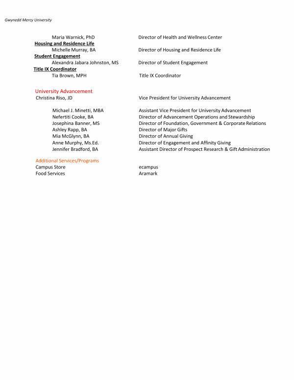 Director of Health and Wellness Center Director of Housing and Residence Life Director of Student Engagement Title IX Coordinator