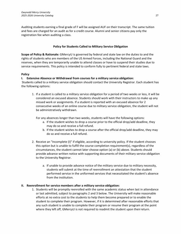 Scope of Policy & Rationale: GMercyU is governed by federal and state law on the duties to and the rights of students who are members of the US Armed Forces, including the National Guard and the reserves, when they are temporarily unable to attend classes or have to suspend their studies due to service requirements. This policy is intended to conform fully to pertinent federal and state laws.
