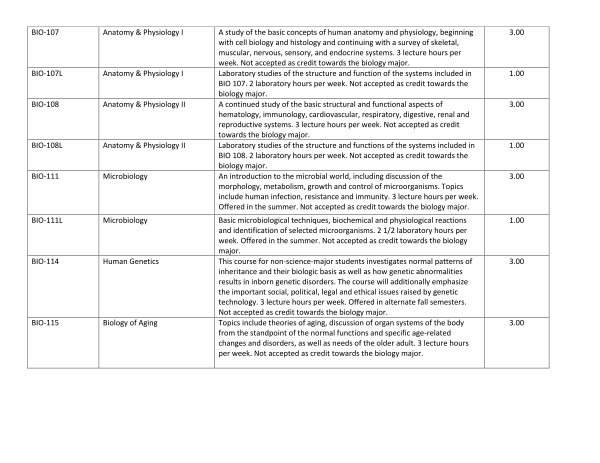 A study of the basic concepts of human anatomy and physiology, beginning with cell biology and histology and continuing with a survey of skeletal, muscular, nervous, sensory, and endocrine systems. 3 lecture hours per week. Not accepted as credit towards the biology major. |