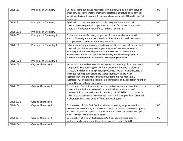 Chemical compounds and reactions; terminology, stoichiometry, solution chemistry, gas laws, thermochemistry, electronic structure and chemical bonding. 3 lecture hours and 1 recitation hour per week. Offered in the fall semester. |