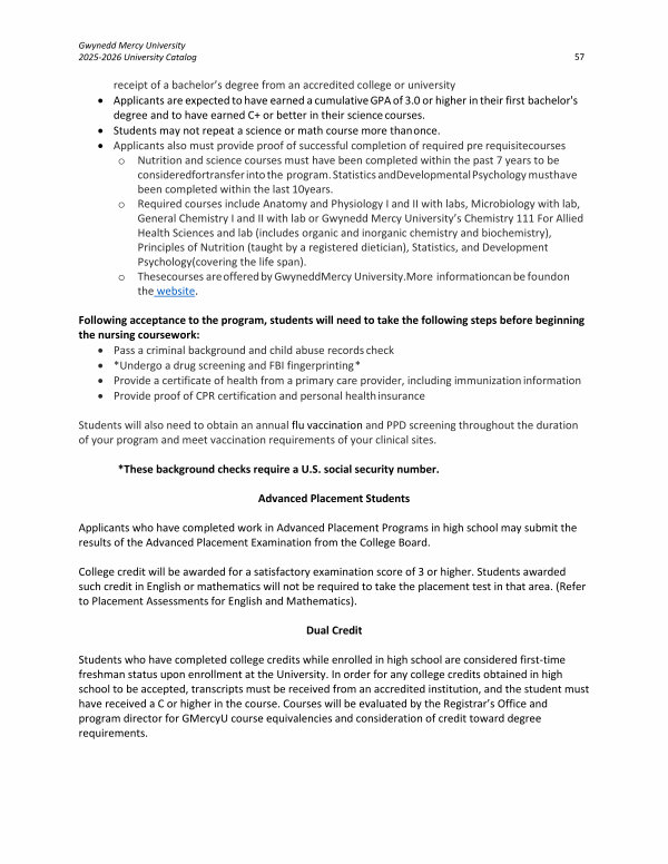 • Applicants also must provide proof of successful completion of required pre requisitecourses o Nutrition and science courses must have been completed within the past 7 years to be consideredfortransfer into the program. Statistics andDevelopmental Psychology musthave been completed within the last 10years. o Required courses include Anatomy and Physiology I and II with labs, Microbiology with lab, General Chemistry I and II with lab or Gwynedd Mercy University’ s Chemistry 111 For Allied Health Sciences and lab( includes organic and inorganic chemistry and biochemistry), Principles of Nutrition( taught by a registered dietician), Statistics, and Development Psychology( covering the life span). o Thesecourses are offered by GwyneddMercy University. More informationcan be foundon the website.