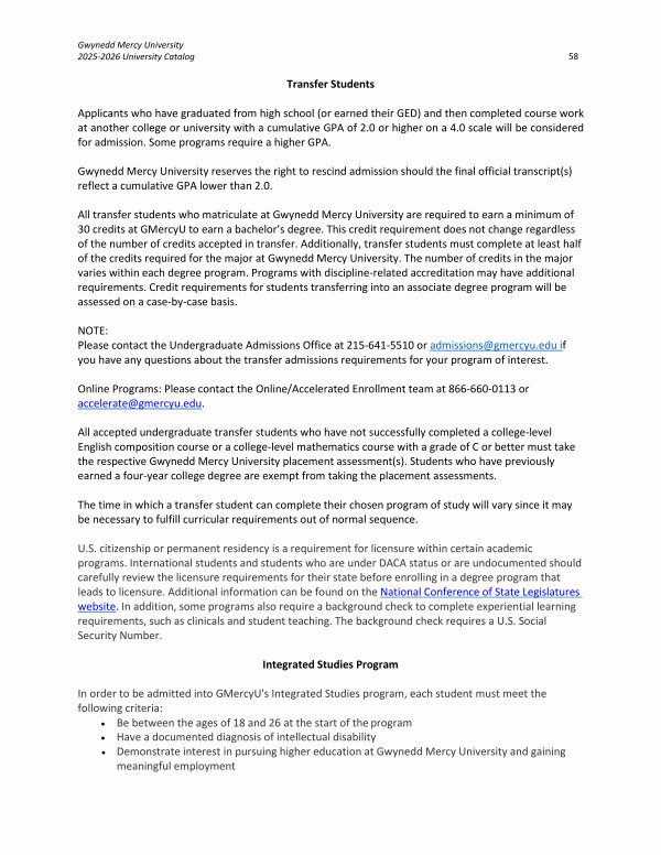 NOTE: Please contact the Undergraduate Admissions Office at 215-641-5510 or admissions @ gmercyu. edu if you have any questions about the transfer admissions requirements for your program of interest.
