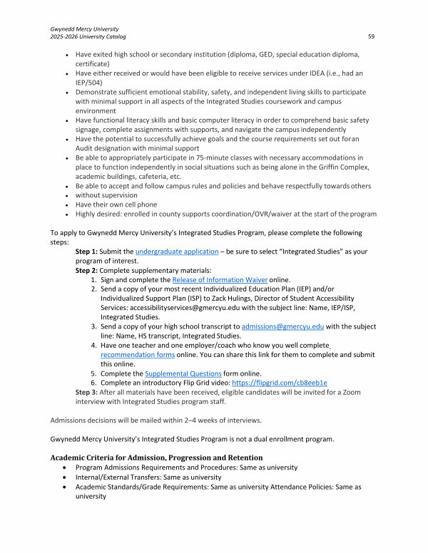To apply to Gwynedd Mercy University’ s Integrated Studies Program, please complete the following steps: Step 1: Submit the undergraduate application – be sure to select“ Integrated Studies” as your program of interest. Step 2: Complete supplementary materials: 1. Sign and complete the Release of Information Waiver online. 2. Send a copy of your most recent Individualized Education Plan( IEP) and / or Individualized Support Plan( ISP) to Zack Hulings, Director of Student Accessibility Services: accessibilityservices @ gmercyu. edu with the subject line: Name, IEP / ISP, Integrated Studies.