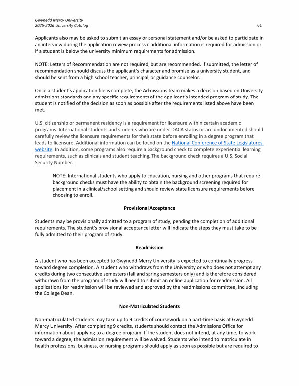 Non-matriculated students may take up to 9 credits of coursework on a part-time basis at Gwynedd Mercy University. After completing 9 credits, students should contact the Admissions Office for information about applying to a degree program. If the student does not intend, at any time, to work toward a degree, the admission requirement will be waived. Students who intend to matriculate in health professions, business, or nursing programs should apply as soon as possible but are required to