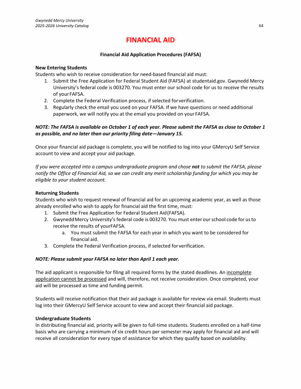 Returning Students Students who wish to request renewal of financial aid for an upcoming academic year, as well as those already enrolled who wish to apply for financial aid the first time, must: 1. Submit the Free Application for Federal Student Aid( FAFSA). 2. Gwynedd Mercy University’ s federal code is 003270. You must enter our school code for us to receive the results of yourFAFSA. a. You must submit the FAFSA for each year in which you want to be considered for financial aid. 3. Complete the Federal Verification process, if selected for verification.