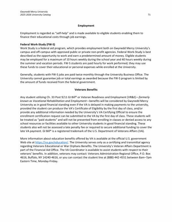 Any student utilizing Ch. 33 Post 9 / 11 GI Bill ® or Veteran Readiness and Employment( VR & E)— formerly known as Vocational Rehabilitation and Employment— benefits will be considered by Gwynedd Mercy University as in good financial standing even if the VA is delayed in making payments to the university, provided the student can produce the VA’ s Certificate of Eligibility by the first day of class, and / or provide any additional information needed by the University’ s VA Certifying Official to ensure the enrollment certification request can be submitted to the VA by the first day of class. These students will be treated as“ paid students” and will not be prevented from enrolling in classes or denied access to any school resources or facilities available to other University students in good financial standing. These students also will not be assessed a late penalty fee or required to secure additional funding to cover the late VA payment. GI Bill ® is a registered trademark of the U. S. Department of Veterans Affairs( VA).