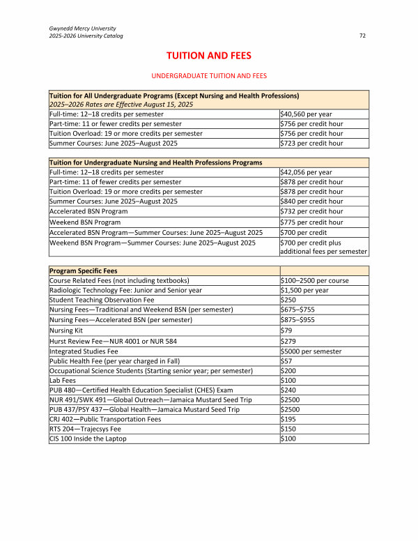 Tuition for All Undergraduate Programs( Except Nursing and Health Professions) | |