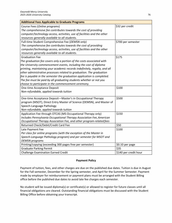 Additional Fees Applicable to Graduate Programs Course Fees( Online programs) The comprehensive fee contributes towards the cost of providing computer / technology access, activities, use of facilities and the other resources generally available to all students. Full-time Student Comprehensive Fee( DEMSN only) The comprehensive fee contributes towards the cost of providing computer / technology access, activities, use of facilities and the other resources generally available to all students. Graduation Fee The graduation fee covers only a portion of the costs associated with the University commencement events, including the cost of diploma printing, maintaining your academic records indefinitely, regalia, and all other administrative processes related to graduation. The graduation fee is payable in the semester the graduation application is completed. The fee must be paid by all graduating students whether or not you choose to participate in the commencement ceremony. One-time Acceptance Deposit Non-refundable, applied towards tuition