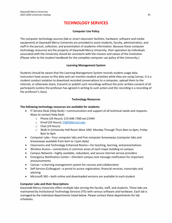 The computer technology sources( lab or smart classroom facilities, hardware, software and media equipment) at Gwynedd Mercy University are provided to assist students, faculty, administration, and staff in the pursuit, collection, and presentation of academic information. Because these computer technology resources are the property of Gwynedd Mercy University, their operation by individuals associated with the University should be consistent with the mission and values of the institution.( Please refer to the student handbook for the complete computer use policy of the University.)