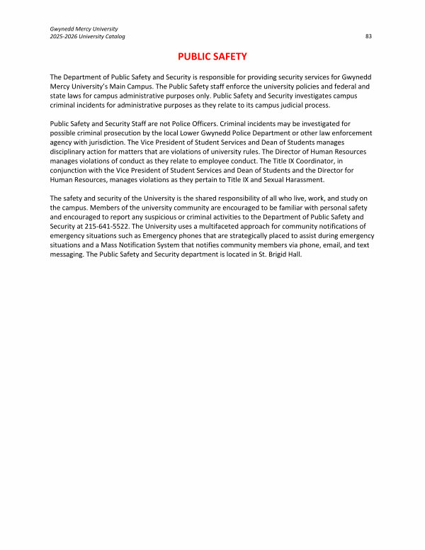 The Department of Public Safety and Security is responsible for providing security services for Gwynedd Mercy University’ s Main Campus. The Public Safety staff enforce the university policies and federal and state laws for campus administrative purposes only. Public Safety and Security investigates campus criminal incidents for administrative purposes as they relate to its campus judicial process.